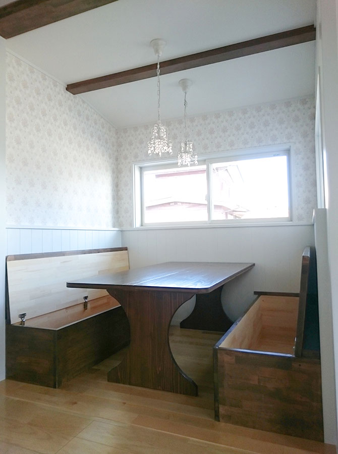 しばらくしてから今度はダイニングの増築を依頼されました。畳2帖ほどの小さなダイニングですが、ベンチの座面部分に蓋を設けることで収納スペースも確保しています。家族の集うダイニングテーブルはオーダーメイドの商品でコストを抑えるために桧のJパネルを用いつつ、アクセントにナラの無垢材で中央にラインを入れました。