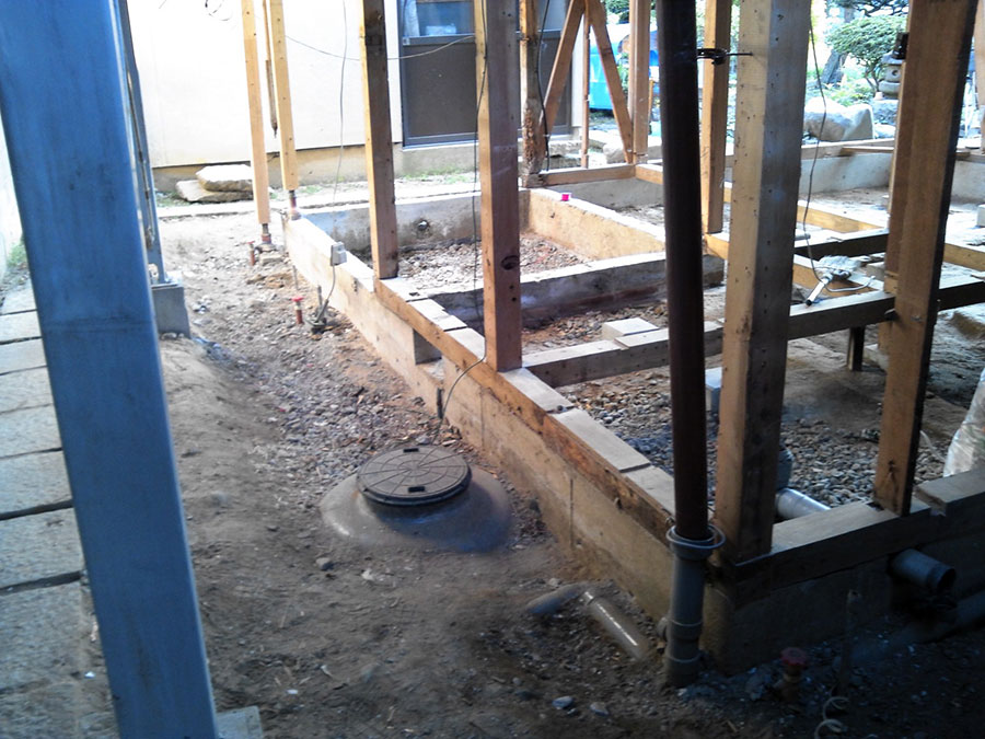 一方で、昭和になってから改修されたキッチンや浴室、トイレといった水廻り空間の老朽化が進み、不便を強いられていたそうです。そういった内玄関からなる生活ゾーンの改修は空間面積や動線の配慮に始まり、既存構造材や既設配管との兼ね合いもあって平面計画に時間を費やました。